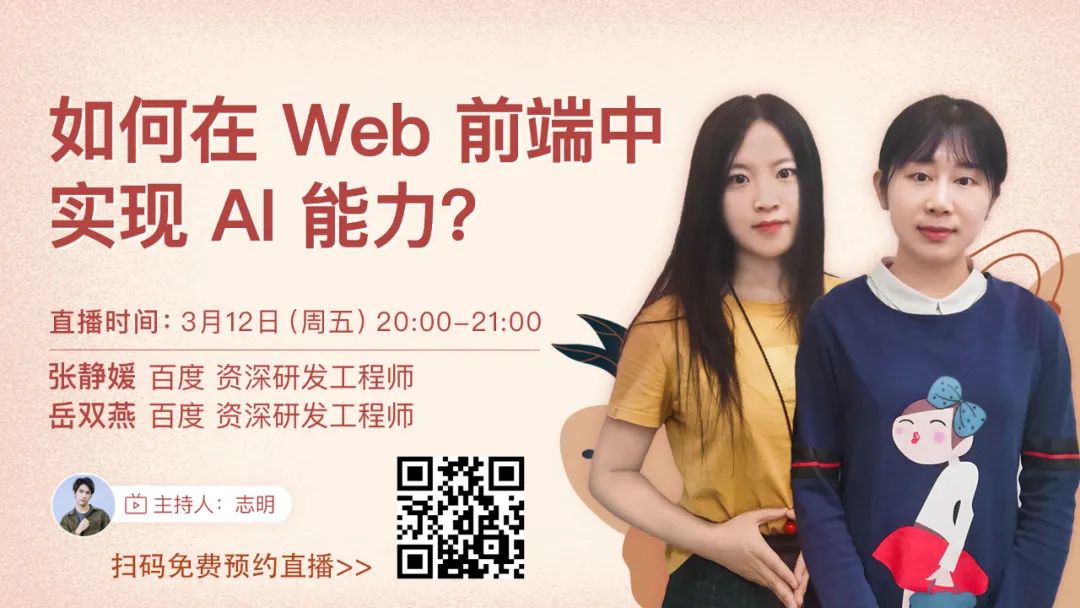想要了解如何在 Web 前端中借助 Paddle.js 实现 AI 能力、提升计算速度、低代码甚至零代码部署 AI 效果吗?本周五晚 20:00,百度资深研发工程师张静媛&岳双燕将分享《如何在 Web 前端中借助 Paddle.js 实现 AI 能力?》,扫描二维码或点击阅读原文立即预约直播。