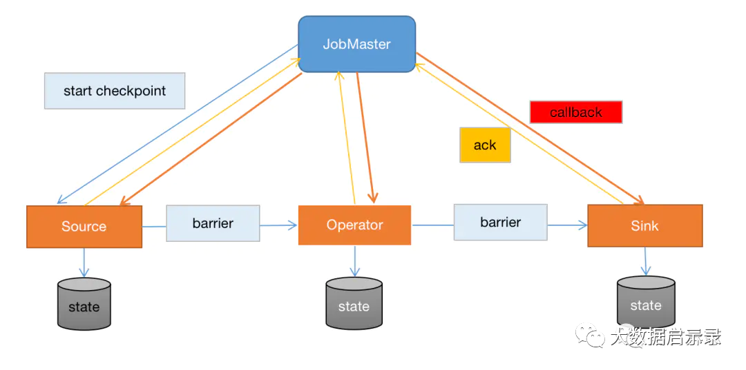 1. jobMaster 会周期性的发送执行checkpoint命令(start checkpoint);