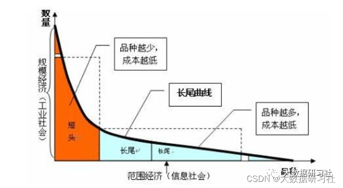 ⻓尾理论:由于成本和效率的因素,当商品储存、流通、展示的场地和渠道⾜够宽⼴,商品⽣产成本急剧下降以⾄于个⼈都可以进⾏⽣产,并且商品的销售成本急剧降低时,⼏乎任何以前看似需求极低的产品,只要有卖,都会有⼈买。这些需求和销量不⾼的产品所占据的共同市场份额,可以和主流产品的市场份额相当,甚⾄更⼤。