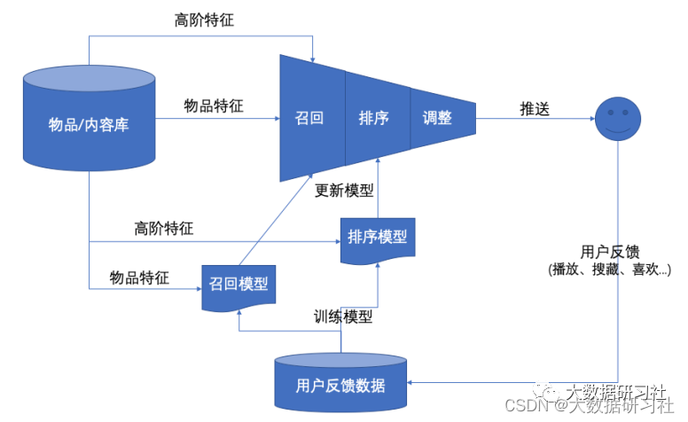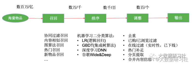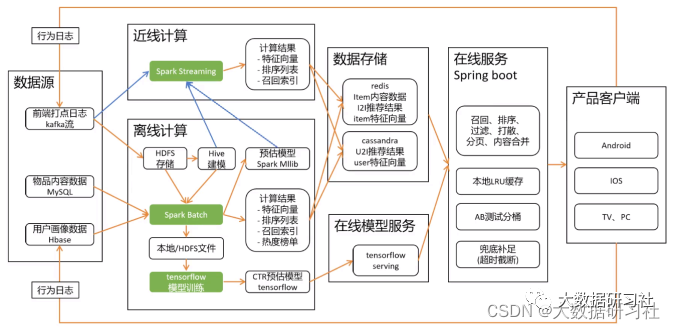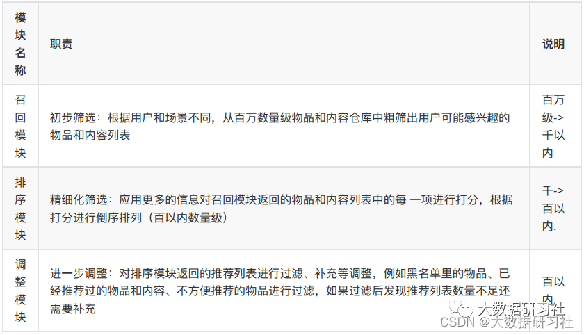 推荐系统的核心就是要在庞⼤的商品、⽂章、好友等⼈或物中找出⽬标⼈或者⼈群喜欢的⼈或者物,要完成这项⼯作整体流程是⽐较⻓的,⼀般按照先后顺序分为如下⼏个核⼼模块,下⾯是各模块的职责及说明: