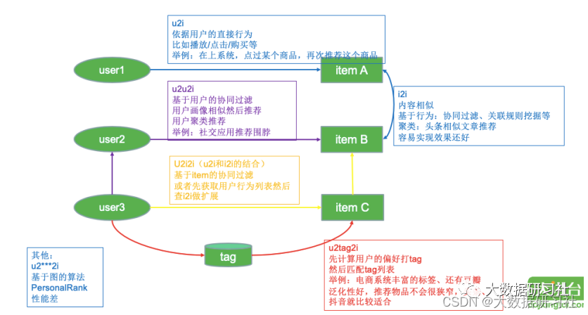 推荐系统中常⻅的名词,如i2i、 u2i、 u2i2i、 u2u2i、 u2tag2i,它们指的是召回路径或者叫召回流派。这⾥通过⼀个图来给⼤家解释下召回路径: