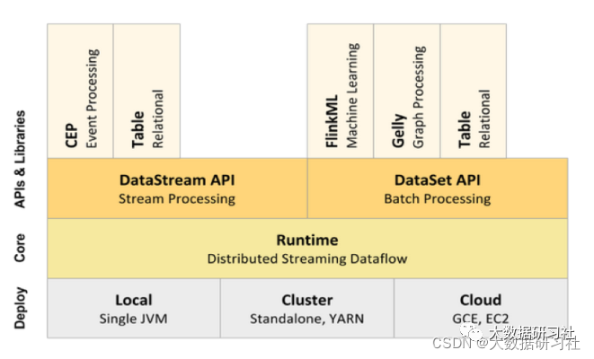 在API层之上构建的满⾜特定应⽤的实现计算框架(库),分别对应⾯向流处理和⾯向批处理这两类。