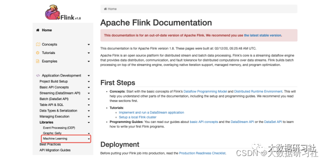 Flink背后的商业公司Data Artisans被阿⾥收购之后,从Flink1.9开始FlinkML模块已经没有了,⼀直在重构,⾄今还没有正式回归;阿⾥开源的Alink(新开源的机器学习库)已经⾮常成熟。