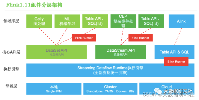 <2>⾯向批处理⽀持:FlinkML(机器学习库)、 Alink(新开源的机器学习库) 、 Gelly(图计算)。