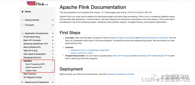 Flink还提供了⽤于特定领域的库,这些库通常被嵌⼊在API中,但不完全独⽴于API。这些库也因此可以继承API的所有特性,并与其他库集成。