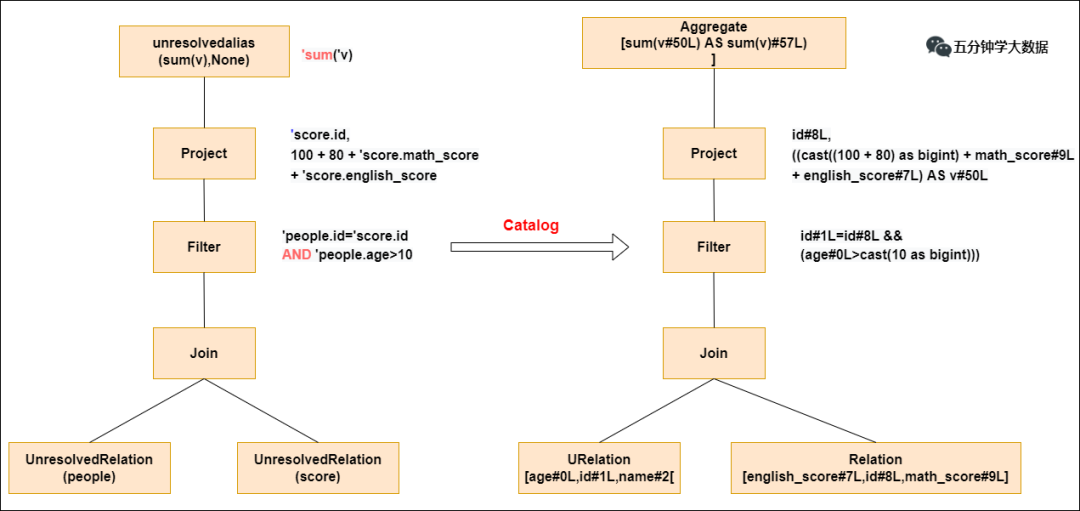 Analyzer模块:该模块会遍历整个AST,并对AST上的每个节点进行数据类型的绑定以及函数绑定,然后根据元数据信息Catalog对数据表中的字段进行解析。