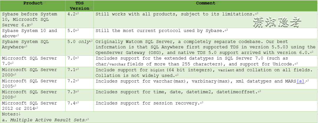 freetds官方文档[2] 有介绍TDS协议版本,有兴趣可以了解一下,简单描述如下所示: