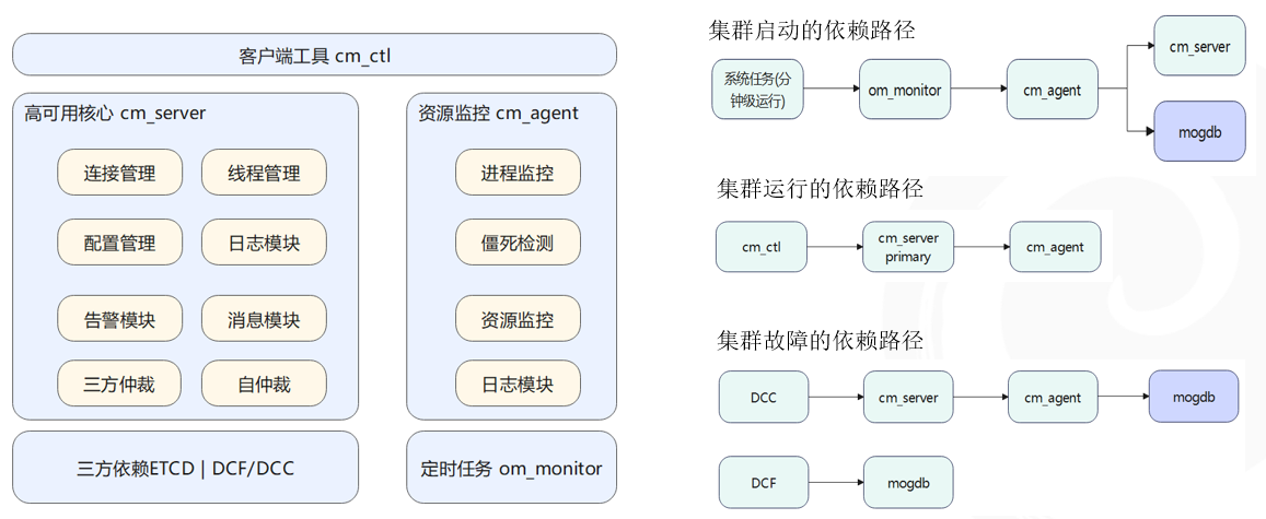 CM集群管理分为om_monitor, cm_ctl, cm_server, cm_agent四大模块,依赖DCF, DCC两大模块实现自研高可用仲裁。其中cm_server服务无需在每个节点进行部署,可以依据需求多个节点共用一个,但需要确保自身高可用。