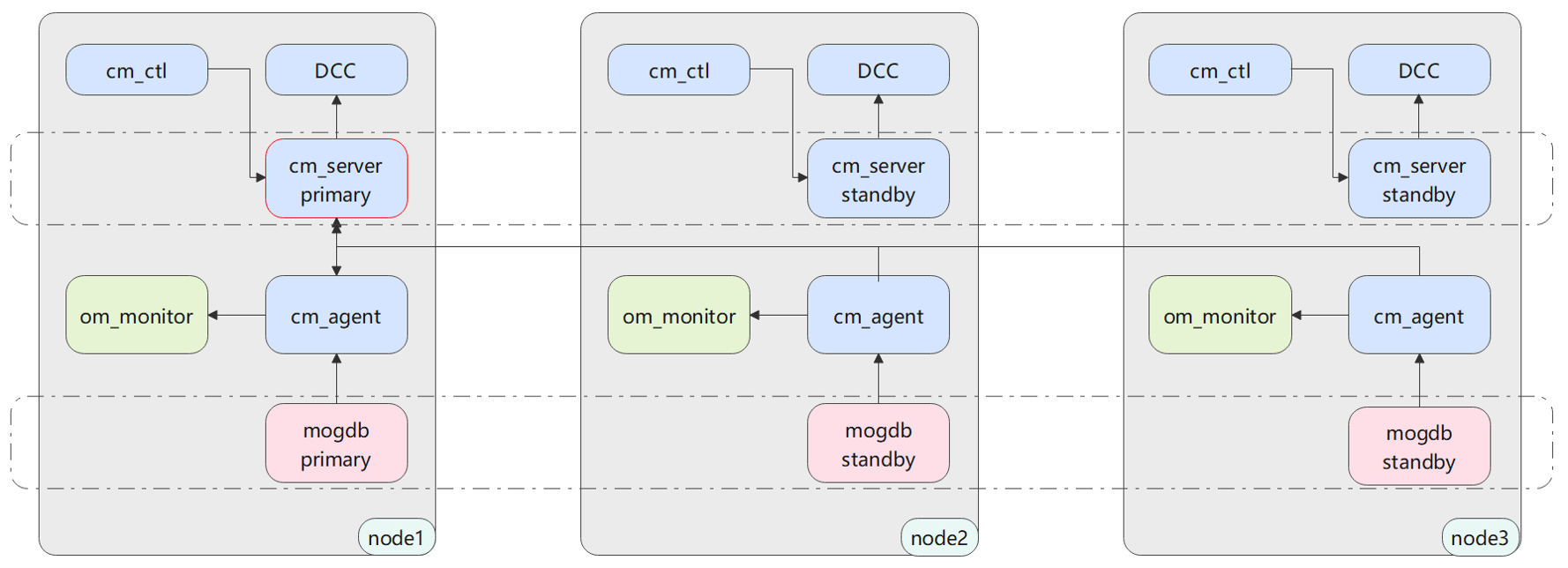 cm_server是整个集群管理的核心模块,负责集群中各mogdb实例状态的检测,以及对每一组mogdb服务主备高可用角色的仲裁。基于此,一旦mogdb主实例故障,cm_server将触发故障切换机制使得备实例升主,确保集群的可用性。