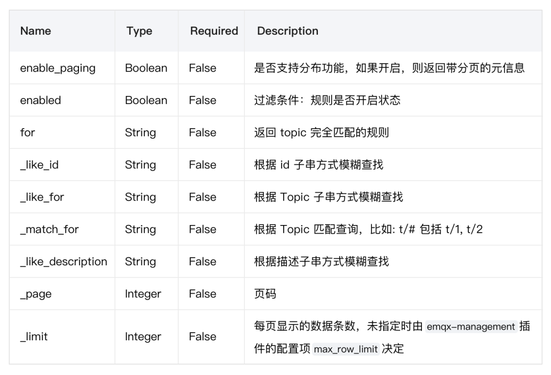 规则引擎列表查看 REST API 支持分页与模糊搜索包括规则的 SQL、Topics 列表、动作列表等。此特性旨在于让用户更方便地管理规则,尤其是规则数量较多的时候。