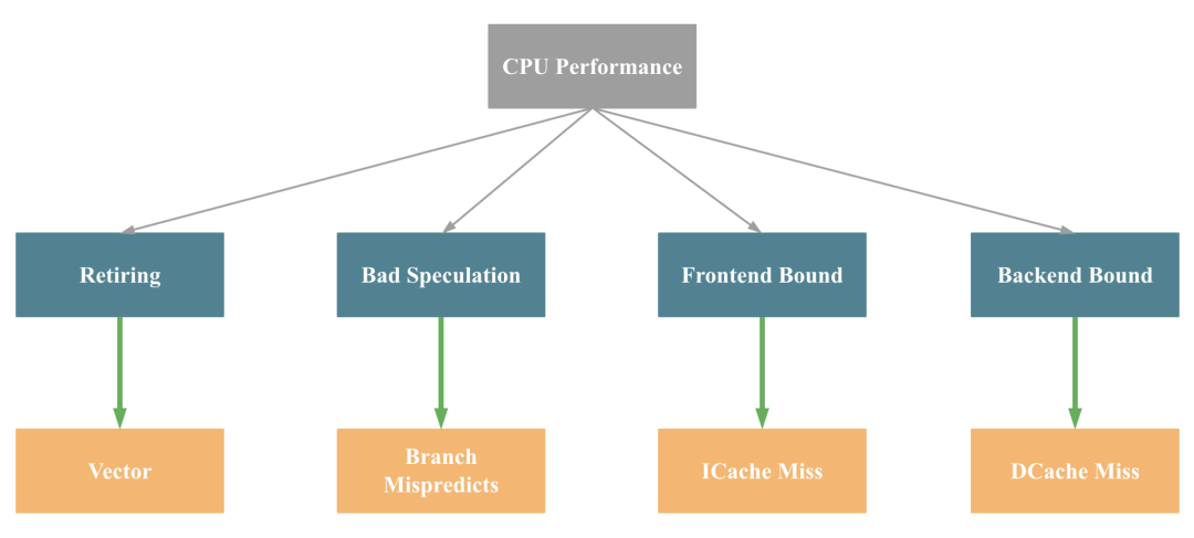 即影响一个 CPU 程序的性能瓶颈主要有4大点:Retiring、Bad Speculation、Frontend Bound 和 Backend Bound,4个瓶颈点导致的主要原因(不完全准确)依次是:缺乏 SIMD 指令优化,分支预测错误,指令 Cache Miss, 数据 Cache Miss。