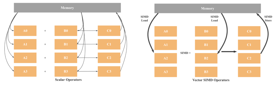 注意,在第二个章节里面,向量化一词可以理解为和 SIMD 等价,仅指狭义上的 CPU SIMD 向量化,与数据库领域广义的向量化含义不同。