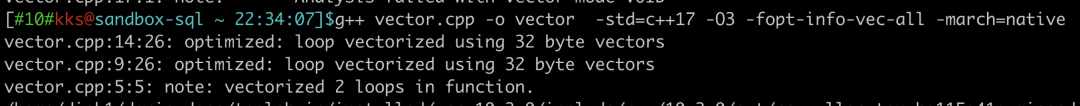 第一种是给编译器加一些编译选项,编译器会输出某些代码是否触发向量化,以及没有向量化的原因。比如 GCC 编译器,我们可以加入 -fopt-info-vec-all 或者 -fopt-info-vec-optimized,-fopt-info-vec-missed,-fopt-info-vec-note 编译选项。效果如下图所示: