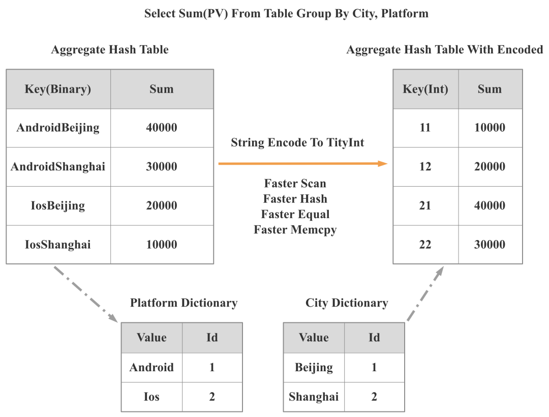 2. 数据结构和算法:高效的数据结构和算法可以直接在数量级上减少 CPU 指令数。在 StarRocks 2.0 中,我们引入了低基数全局字典,可以通过全局字典将字符串的相关操作转变成整形的相关操作。如下图所示,StarRcoks 将之前基于两个字符串的 Group By 变成了基于一个整形的 Group By,这样 Scan、Hash 计算、Equal、Memcpy 等操作都会有数倍的性能提升,整个查询最终会有 3 倍的性能提升。