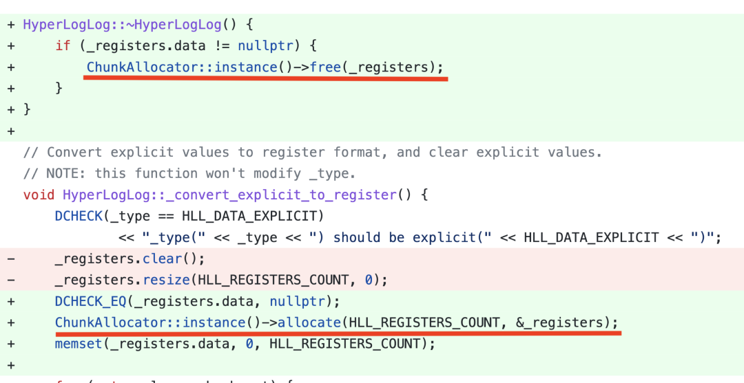 6. 内存管理优化:当 Batch Size 越大、并发越高,内存申请和释放越频繁,内存管理对性能的影响越大。我们实现了一个 Column Pool,用来复用 Column 的内存,显著优化了整体的查询性能。下图是一个 HLL 聚合函数内存优化的代码示意,通过将 HLL 的内存分配变成按 Block 分配,并实现复用,将 HLL 的聚合性能直接提升了 5 倍。