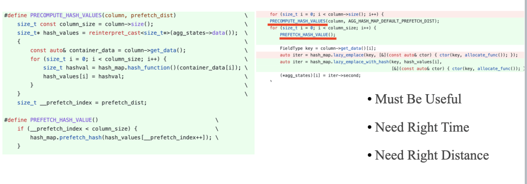 下面的代码展示了我们利用 Prefetch 优化 Cache Miss 的示例,我们需要知道,Prefetch 应该是最后一项优化 CPU Cache 的尝试手段,因为 Prefetch 的时机和距离比较难把握,需要充分测试。
