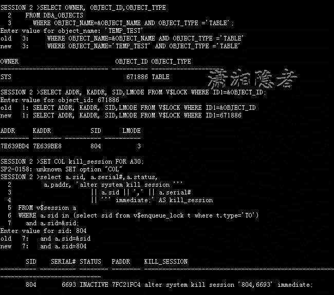 上面的脚本适合于讲述如何解决ORA-14450错误,在生产环境中,肯定需要快速解决问题,上面脚本太繁琐,你可以使用下面脚本kill_session_ora_14450.sql找出涉及临时表的会话,并生成kill session的脚本。