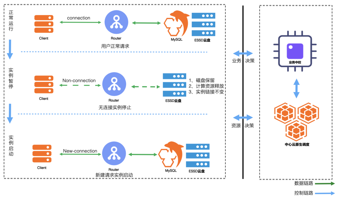 为了给研发/测试实例或者周期无负载实例提供更极致的成本优化,MySQL Serverless支持了实例的自动启停功能,以便客户在不需要访问数据库的时候,让其进入静默状态,可以进一步给客户带来资源成本的节省。