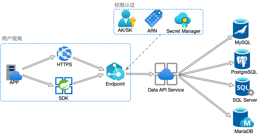 RDS自有的Secret Manager系统会安全地保存好您的数据库访问凭证(用户名,密码),通过ARN标识符,我们可以确认您对您的serverless数据库的访问权限,并为您提供以RESTful API,SDK集成等方式灵活地执行SQL语句与数据库进行交互的能力。用户示意图如下: