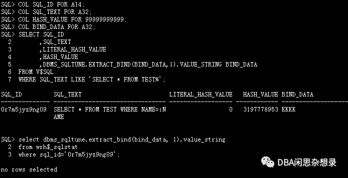 如上测试所示,这个获取绑定变量值的方法有一定的缺陷性,有可能V$SQL快照信息没有被捕获到,导致wrh$_sqlstat 里面查不到对应的信息。