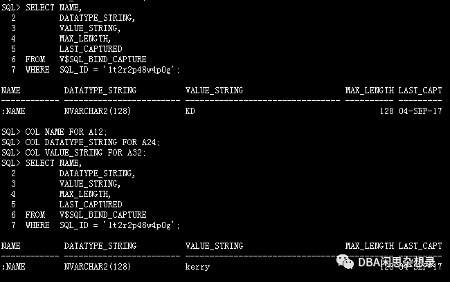 如上所示,我给变量赋予新的值,然后重新执行一次,你执行上面SQL,发现绑定变量的值为kerry了,之前的值KD就无法找到了。所以这个也是这个视图的一个局限性。(注意,实验结果结果也有可能是KD,这个取决于实验的时间间隔与隐含参数_cursor_bind_capture_interval的值有关系)