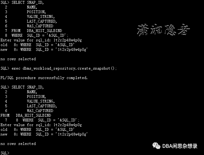 DBA_HIST_SQLBIND是视图V$SQL_BIND_CAPTURE历史快照. 所以从视图DBA_HIST_SQLBIND能查到多个绑定变量的值。但是这里依然会遇到一个问题,就是有可能历史快照没有被捕获到DBA_HIST_SQLBIND下。如下测试所示:
