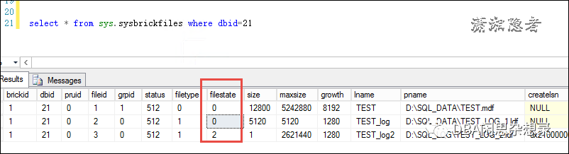 可以看出sys.master_files的state值来自于系统基表sys.sysbrickfiles的filestate字段,我们从DAC模式去查看,发现TEST数据库(dbid=21)的filestat为0,这个值应该为6才对,另外,还有一个让人意外的是,这个系统表里面关于TEST数据库有两个事务日志文件记录,实际上只有一个(其实这个是前阵子写这篇博客“MS SQL 事务日志管理小结”时,测试添加、删除数据事务日志文件遗留下来的记录,不清楚是Bug还是什么问题导致在系统基表还存在这样的一条记录)
