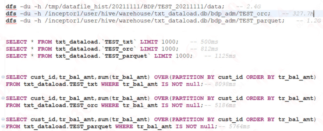 对于需要 MapReduce 操作的查询,效率: ORC >= Parquet > TextFile