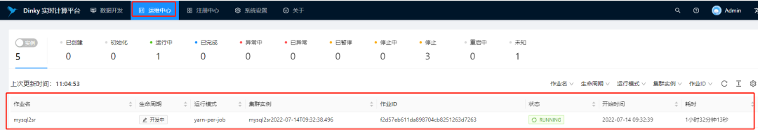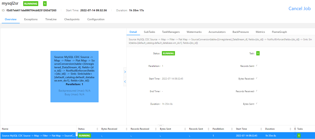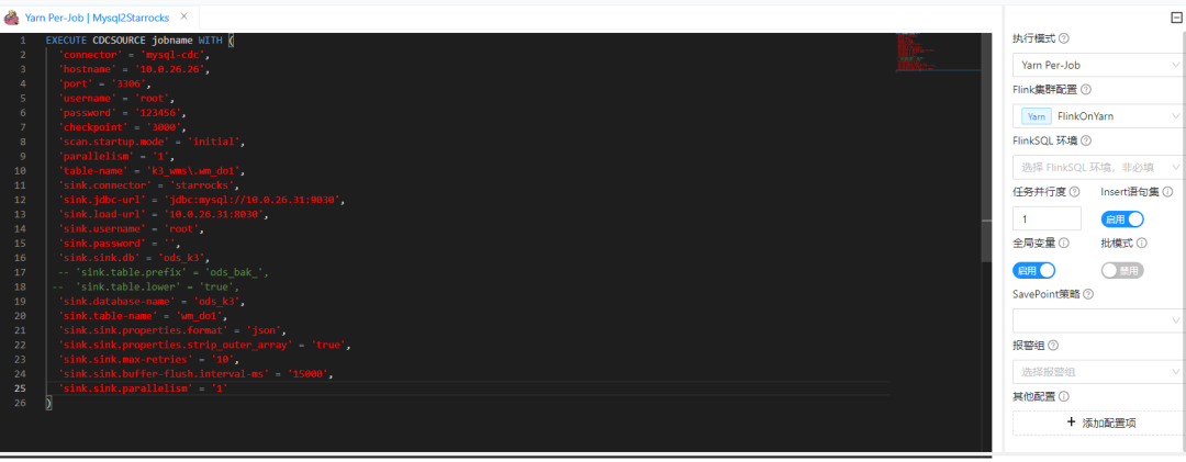 -- mysql DDLCREATE TABLE `wm_do1` (`do_id` varchar(20) COLLATE utf8mb4_bin NOT NULL COMMENT '出库单号',PRIMARY KEY (`do_id`)) ENGINE=InnoDB DEFAULT CHARSET=utf8mb4 COLLATE=utf8mb4_bin COMMENT='出库单主表'-- starrocks DDLCREATE TABLE IF NOT EXISTS `ods_k3`.`wm_do1` (`do_id` STRING NOT NULL COMMENT "出库单号") ENGINE=olapPRIMARY KEY(`do_id`)COMMENT "出库单主表"DISTRIBUTED BY HASH(`do_id`) BUCKETS 1PROPERTIES ("replication_num" = "3");-- dlink CDCSOURCE代码EXECUTE CDCSOURCE jobname WITH ('connector' = 'mysql-cdc','hostname' = '127.0.0.1','port' = '3306','username' = 'root','password' = '123456','checkpoint' = '3000','scan.startup.mode' = 'initial','parallelism' = '1','table-name' = 'k3_wms\.wm_do1','sink.connector' = 'starrocks','sink.jdbc-url' = 'jdbc:mysql://127.0.0.1:9030','sink.load-url' = '127.0.0.1:8030','sink.username' = 'root','sink.password' = '','sink.sink.db' = 'ods_k3',-- 'sink.table.prefix' = 'ods_bak_',-- 'sink.table.lower' = 'true','sink.database-name' = 'ods_k3','sink.table-name' = '${tableName}','sink.sink.properties.format' = 'json','sink.sink.properties.strip_outer_array' = 'true','sink.sink.max-retries' = '10','sink.sink.buffer-flush.interval-ms' = '15000','sink.sink.parallelism' = '1')