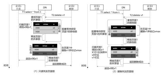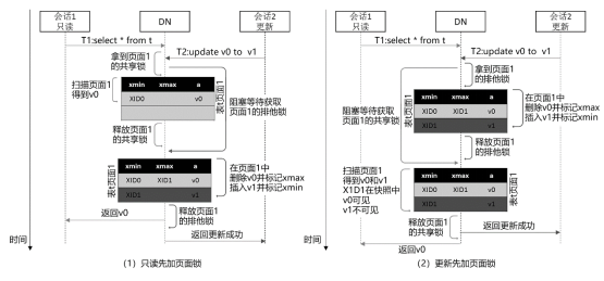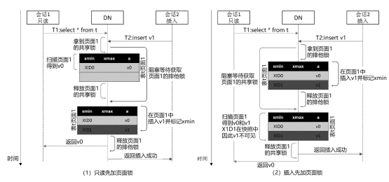 另一方面,对于底层数据的访问和修改,如物理页面和元组,为了保证读、写操作的原子性,需要在每次的读、写操作期间加上共享锁或排他锁。当每次读、写操作完成之后,即可释放上述锁资源,无须等待事务提交,持锁窗口相对较短。