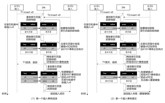 写-写并发的场景有以下6种:插入-插入并发、插入-删除并发、插入-更新并发、删除-删除并发、删除-更新并发、更新-更新并发。下面就插入-插入并发、删除-删除并发和更新-更新并发的控制流程做简要描述,另外三种并发场景下的控制流程读者可自行思考。