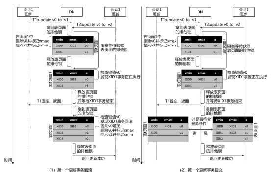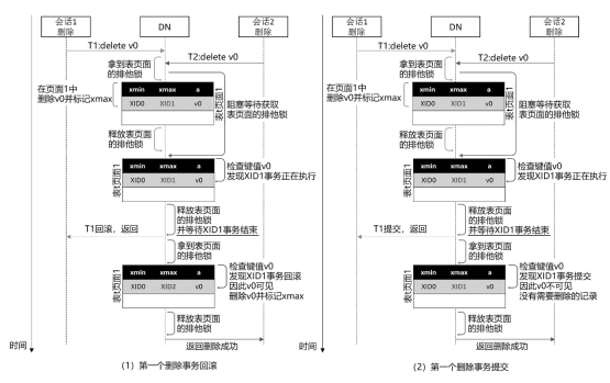 5为删除-删除事务的并发控制流程图。对于并发的删除-删除事务,它们都会尝试去修改同一条元组的xmax值。一般通过页面排他锁来控制该冲突。对于后加上锁的删除事务,它在再次标记元组xmax值之前,首先需要判断先来删除事务(即元组当前xmax事务号对应的事务)的提交结果。如果先来删除事务提交了,那么该元组对后来删除事务不可见,后来删除事务无元组需要删除;如果先来删除事务回滚了,那么该元组对后来删除事务依然可见,后来删除事务可以继续执行对该元组的删除操作。