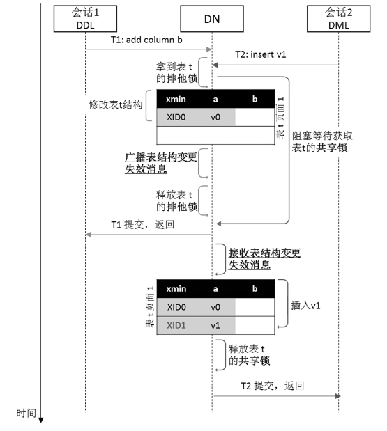 以增加字段的 DDL事务和插入事务并发执行为例,它们的并发执行流程如图7 所示。首先,DDL事务会获取表级的排他锁,而 DML事务在执行之前,需要获取表级的共享锁。DDL事务持锁之后,会执行新增字段操作。然后,DDL事务会给其他所有并发事务发送表结构失效消息,告诉其他并发事务,这个表的结构被修改了。最后,DDL事务释放表级排他锁,提交返回。