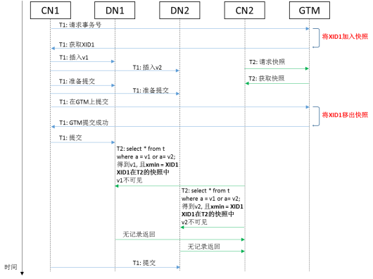 细心的读者会发现,在图9的两阶段提交流程中,写事务 T1在各个 DN 上完成准备之后,首先第一步是到 GTM 上结束 T1事务(将 T1从全局快照中移除),然后第二步到各个 DN 上进行提交。在这种情况下,如果查询事务 T2是在第一步和第二步之间在 GTM 上获取快照,并到各个 DN 上执行查询,那么 T2事务读到的 T1事务插入的记录v1和v2,它们xmin对应的 XID1已经不在 T2事务获取到的全局快照中,因此v1和v2的可见性判断会完全基于 T1事务的提交状态。然而,此时XID1对应的T1事务在各个 DN 上可能还没有全部或部分完成提交,那么就会出现各个 DN 上可见性不一致的情况。