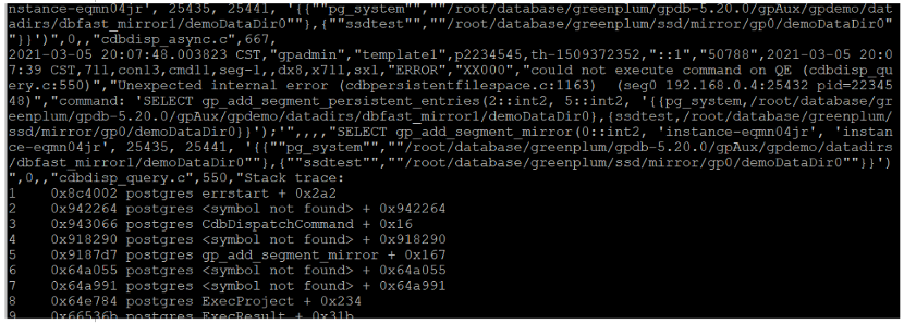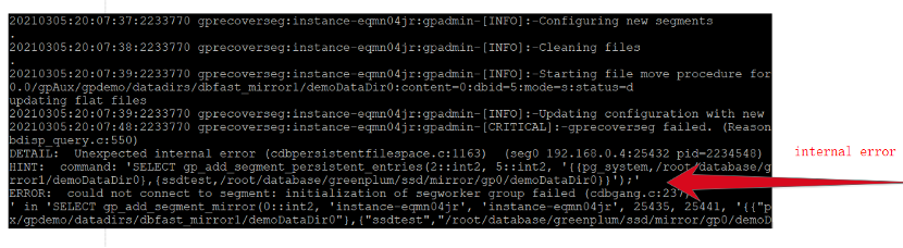 could not execute command on QE (cdbdisp_query.c:550)","Unexpected internal error (cdbpersistentfilespace.c:1163)。