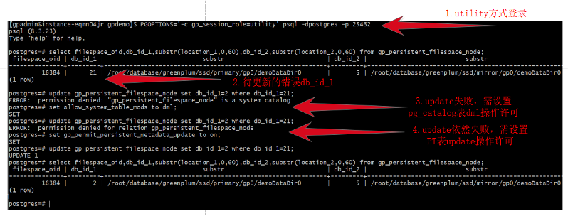 很明显gp_persistent_filespace_node中的db_id_1=21是一个不存在的dbid,在进行filespace状态同步匹配不到,从而抛错。正确的db_id_1应该为port=25432对应的dbid=2。