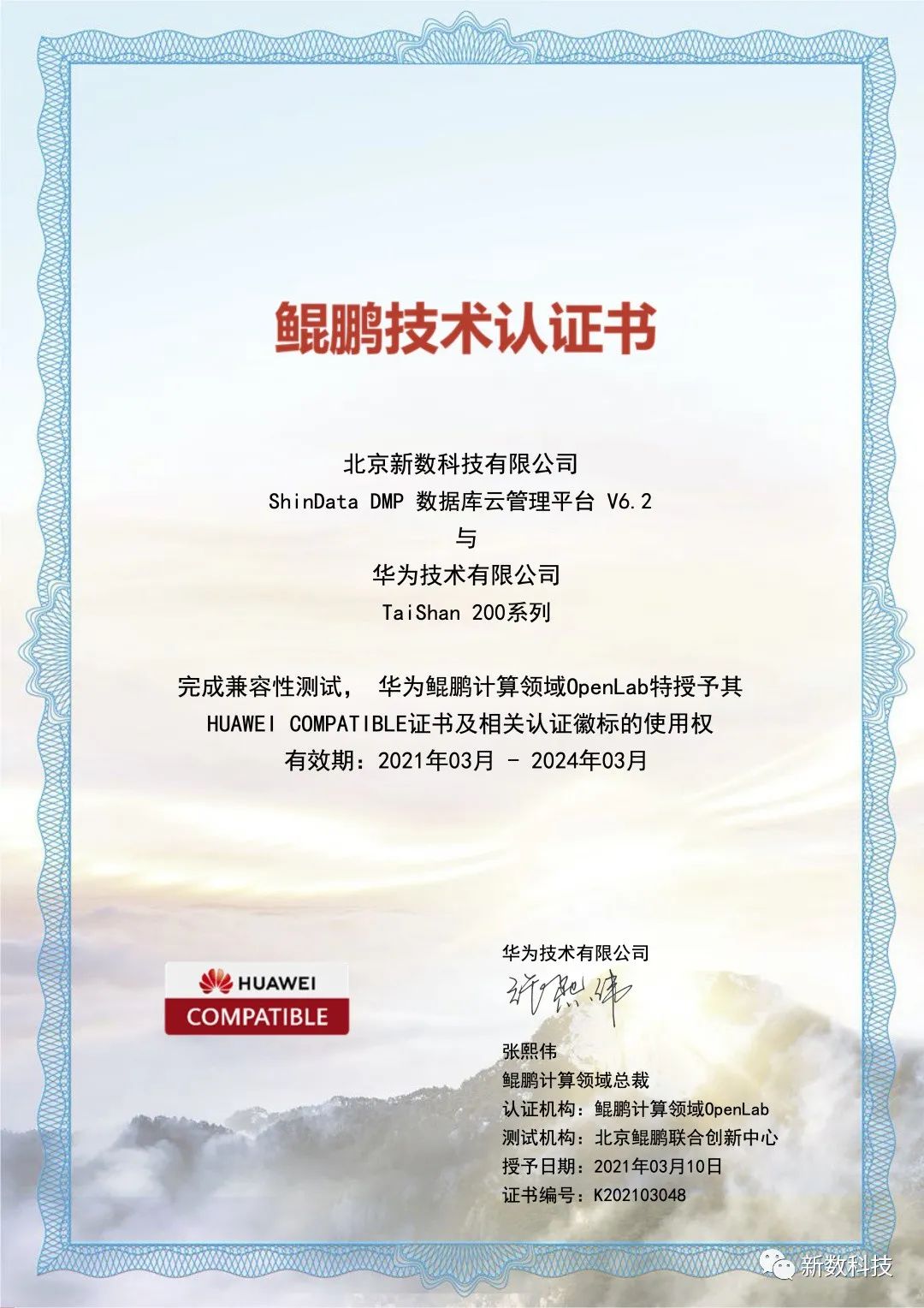 近日,继ShinDB 分布式数据库管理系统完成鲲鹏技术认证之后,ShinData DMP数据库云管平台 V6.2与华为TaiShan 200系列完成兼容性测试,并全面支持纳管新一代开源数据库管理系统openGauss,标志着ShinData DMP进一步适配国产设备系统平台和开源生态,满足了国产化自主可控的要求,也是新数科技在数据库基础软件信创道路上完成的又一阶段性里程碑。