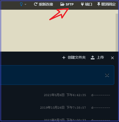 支持 SFTP 图形化方式传文件,直接点击console的右上侧的 SFTP 图标即可上传文件: