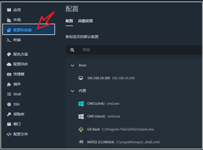 打开配置界面,在配置和连接选项,默认只有内置连接选项: