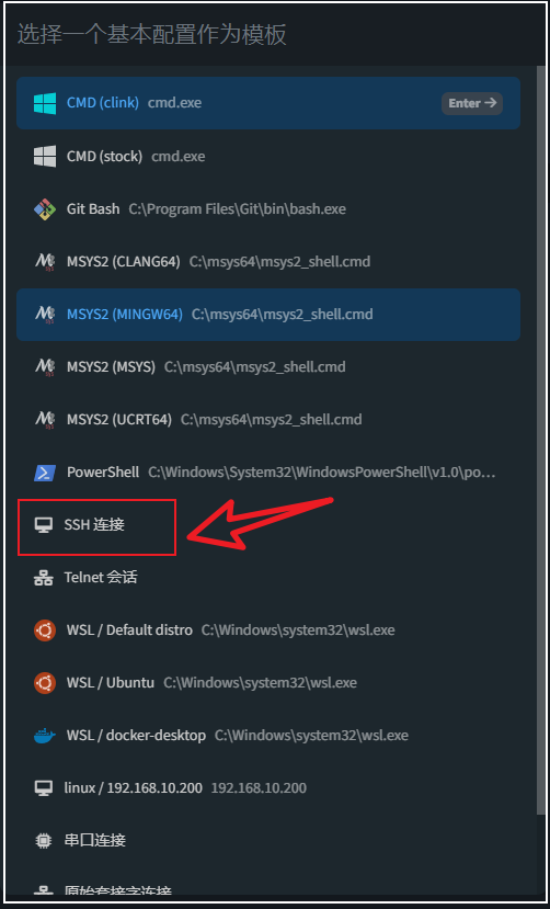 因为程序界面做成了极简,第一次使用的小伙伴不知道从哪儿发起SSH连接,有时一点进去就进入到 windows cmd 界面了,以为 tabby 只是对 windows 的 cmd 或 powershell 做了集成。实际上它除了对现有环境做了集成,自身也支持 ssh、telnet等连接方式。