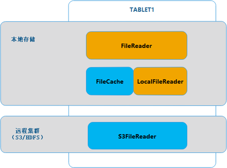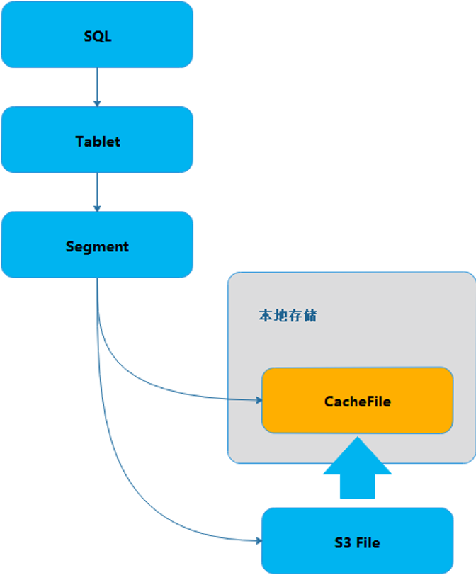 TABLET 下面有着多个 Segment,一部分是热数据,存储在本地目录下;另一部分是冷数据,存储是远程存储集群(S3)下。缓存层即是在两者之间增加了一层,用于将远程数据映射到本地文件。