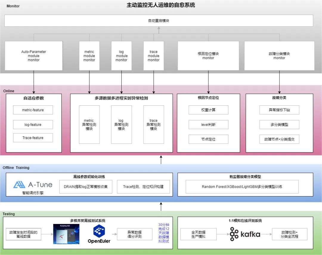 基于本次挑战赛的赛题,AeroSpaceX 战队设计了具备自愈功能、主动监控的整体方案。该方案包含四大部分:整体监控模块、在线推理模块、离线训练模块和测试模块。