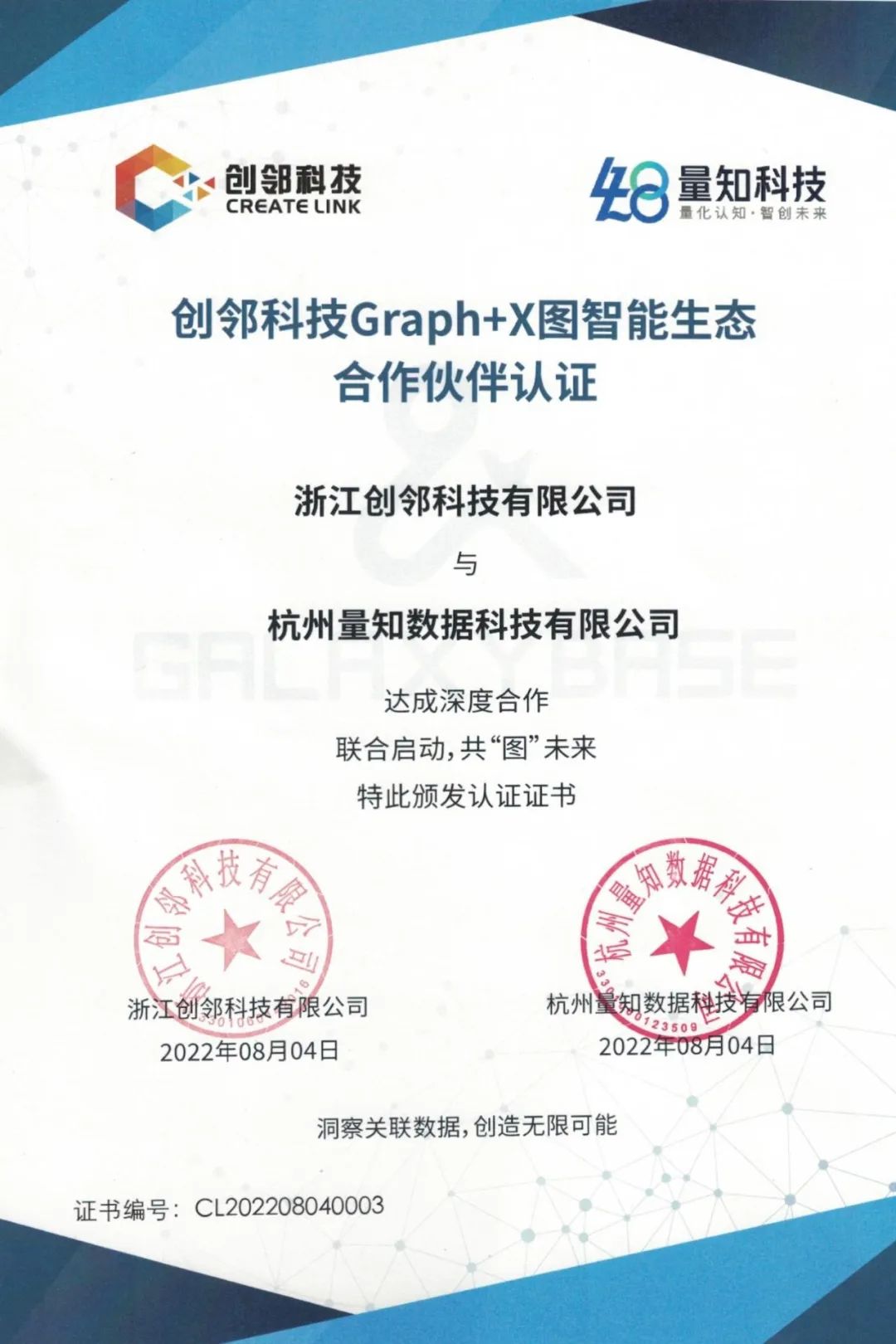 8月4日,杭州量知数据科技有限公司(以下简称“量知科技”)与浙江创邻科技有限公司(以下简称“创邻科技”)签署合作协议,正式加入创邻科技“Graph+X”图智能生态合作体系,开启全方位合作。