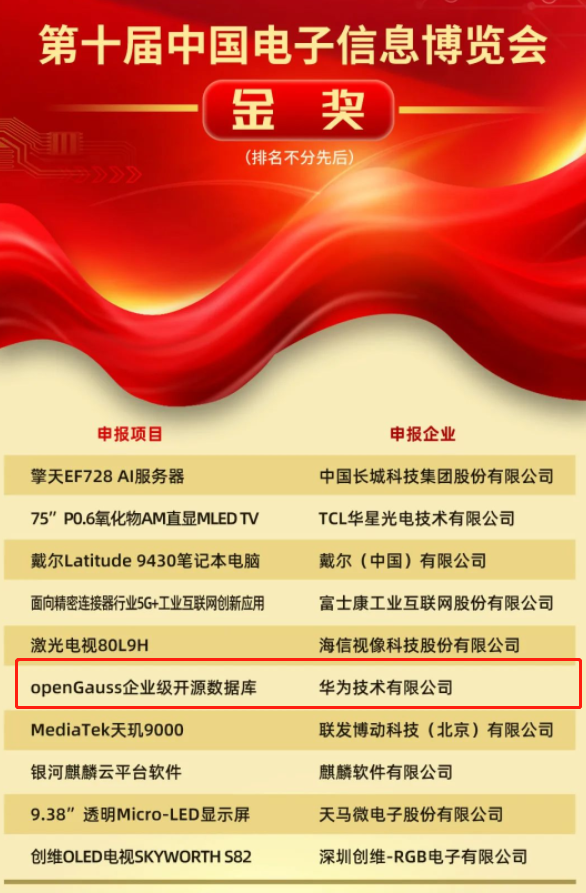 其中,openGauss企业级开源数据库一举摘得本届中国电子信息博览会最高奖项金奖。