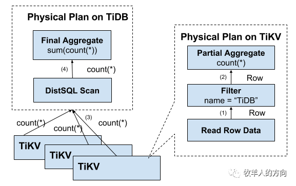 然后,聚合函数Count()也可以被下推到存储节点,进行预聚合,每个节点只需要返回一个Count()的结果即可