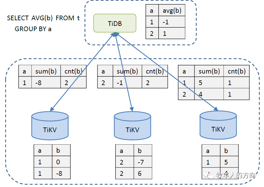 另一个在TiDB层,汇总所有Coprocessor Task的中间结果后,得到最终结果,如示例中HashAgg_10