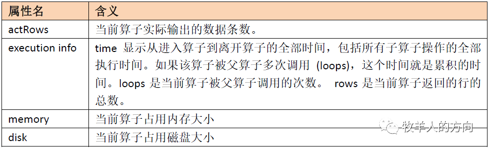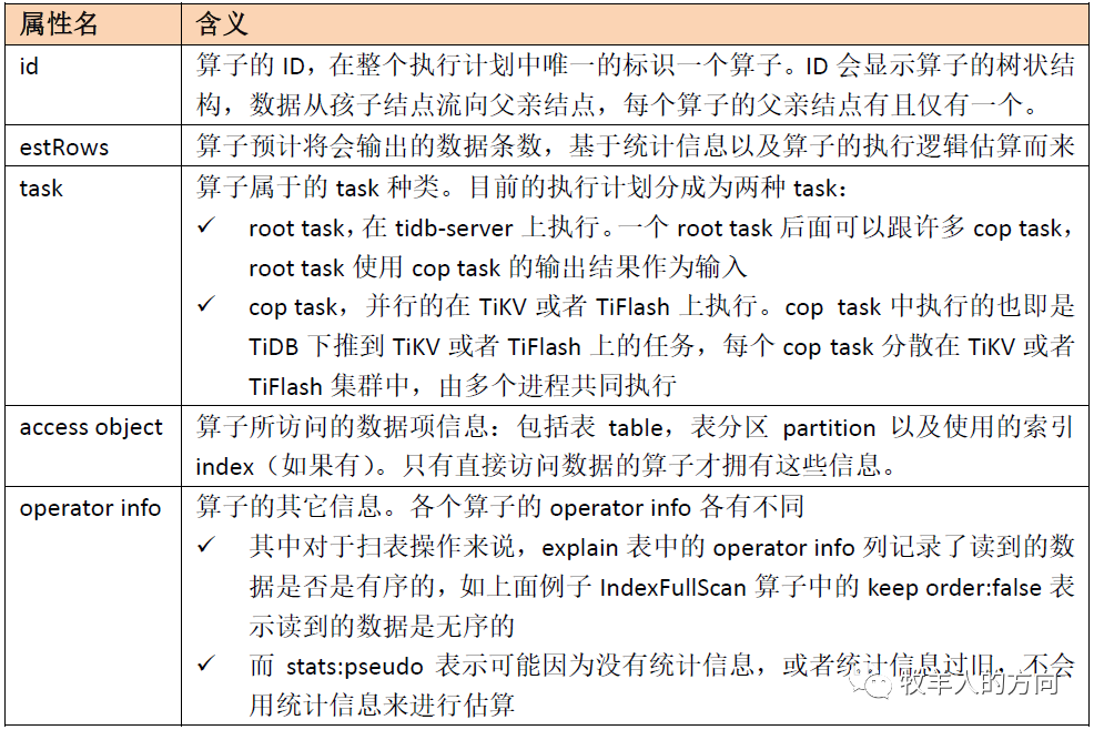 执行计划中每个算子都由这5列属性来描述,EXPLAIN结果中每一行描述一个算子。每个属性的具体含义如下: