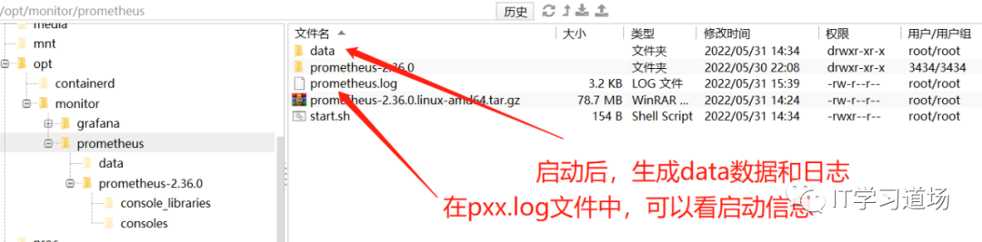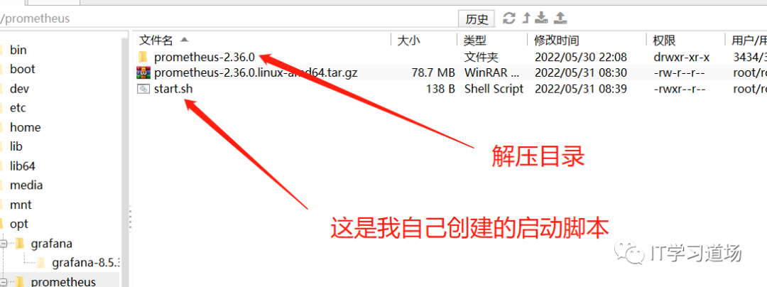 把刚刚下载的prometheus-2.36.0.linux-amd64.tar.gz上传到 /opt/monitor/prometheus文件见下,然后解压即可,解压后的截图