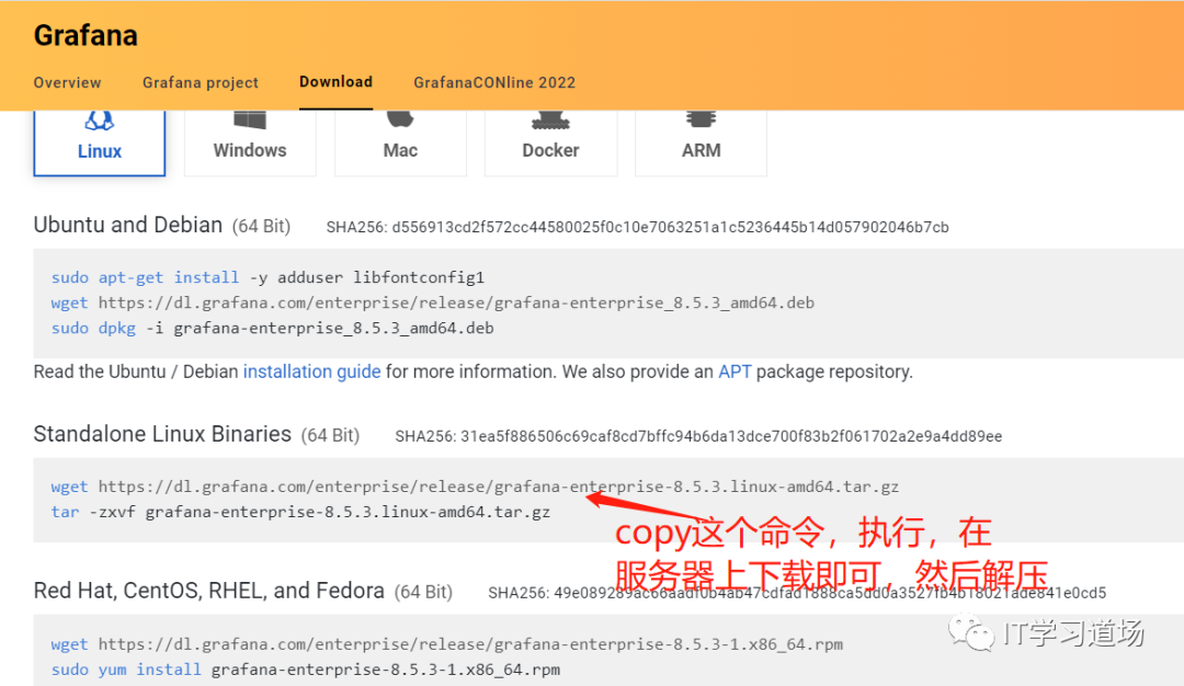 下载地址:https://grafana.com/grafana/download,打开连接,进入grafana的web界面,找到下载命令,在linux中执行即可