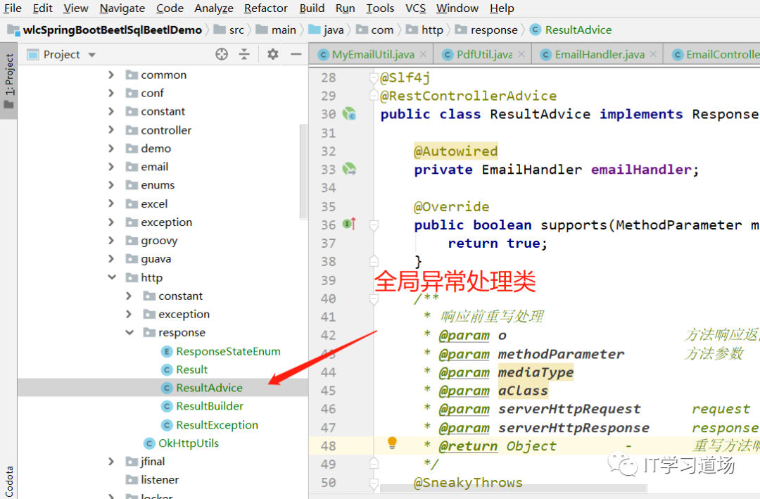 import cn.hutool.core.exceptions.ExceptionUtil;import com.email.EmailHandler;import com.http.constant.HttpCode;import com.http.exception.BusinessException;import com.utils.JsonUtil;import lombok.SneakyThrows;import lombok.extern.slf4j.Slf4j;import org.springframework.beans.factory.annotation.Autowired;import org.springframework.core.MethodParameter;import org.springframework.http.MediaType;import org.springframework.http.converter.HttpMessageConverter;import org.springframework.http.server.ServerHttpRequest;import org.springframework.http.server.ServerHttpResponse;import org.springframework.validation.BindException;import org.springframework.web.bind.MethodArgumentNotValidException;import org.springframework.web.bind.annotation.ExceptionHandler;import org.springframework.web.bind.annotation.RestControllerAdvice;import org.springframework.web.servlet.mvc.method.annotation.ResponseBodyAdvice;import javax.servlet.http.HttpServletRequest;/*** 全局结果响应处理,全局异常处理 <br>* 作者:IT学习道场 <br>* 时间:2019-01-24 10:33*/@Slf4j@RestControllerAdvicepublic class ResultAdvice implements ResponseBodyAdvice<Object> {@Autowiredprivate EmailHandler emailHandler;@Overridepublic boolean supports(MethodParameter methodParameter, Class<? extends HttpMessageConverter<?>> aClass) {return true;}/*** 先捕获异常 然后再把数据返回到ResponseBody中,* 然后在Body中要返回数据的时候调用上面的拦截方法beforeBodyWrite()*/@ExceptionHandler(value = Exception.class)public Object handleException(Object o, Exception e, HttpServletRequest request) {//此处返回json数据//捕捉到的异常如果是自定义异常类,那么就返回自定义异常类中的错误码和错误信息String stackExceptionMsg = ExceptionUtil.stacktraceToString(e);//异常输出到日志log.error(stackExceptionMsg);//自定义基础异常if (e instanceof BusinessException) {return new ResultException(((BusinessException) e).getCode(), false, ((BusinessException) e).getMessage(), request.getRequestURL().toString());//非法参数异常} else if (e instanceof IllegalArgumentException) {return new ResultException(HttpCode.BAD_REQUEST.code, false, "参数异常,请稍候再试", request.getRequestURL().toString());//绑定异常} else if (e instanceof BindException) {return new ResultException(HttpCode.BAD_REQUEST.code, false, ((BindException) e).getBindingResult().getFieldError().getDefaultMessage(), request.getRequestURL().toString());//方法参数异常验证异常} else if (e instanceof MethodArgumentNotValidException) {return new ResultException(HttpCode.BAD_REQUEST.code, false, ((MethodArgumentNotValidException) e).getBindingResult().getFieldError().getDefaultMessage(), request.getRequestURL().toString());}//这里是除了自定义异常的其他异常信息else {// 这里是未知不可控异常,发送异常邮件即可emailHandler.sendExceptionEmail(stackExceptionMsg, e, request);return new ResultException(HttpCode.SERVER_ERROR.code, false, "系统异常请联系管理员", request.getRequestURL().toString());}}}